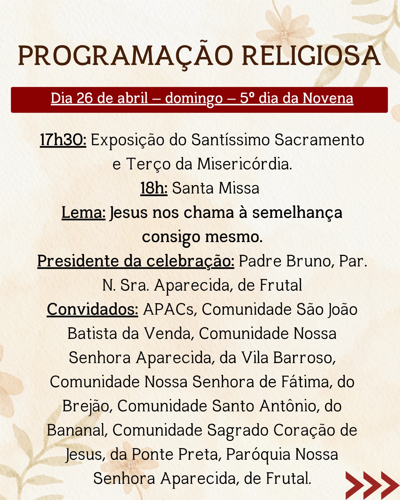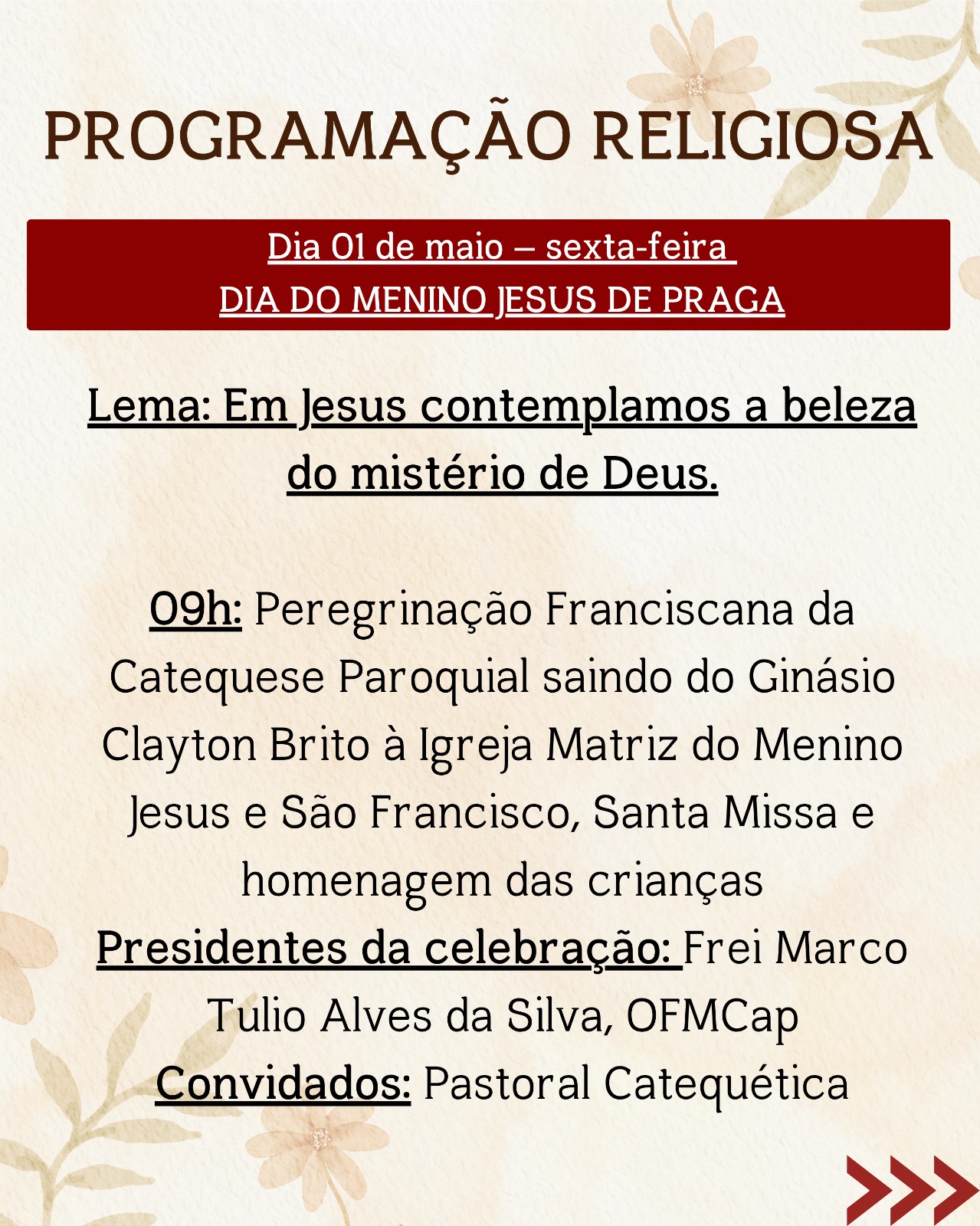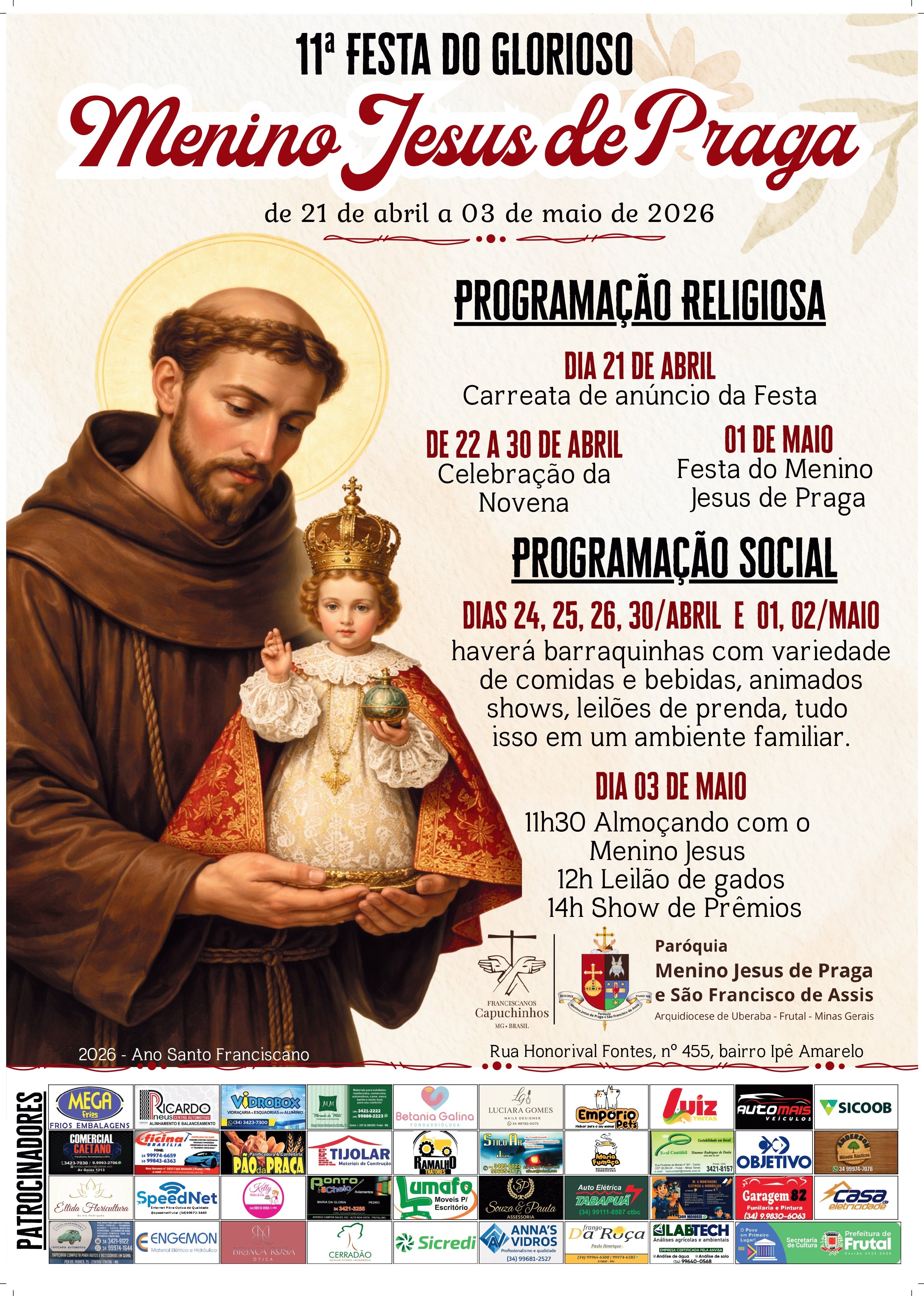 A Paróquia Menino Jesus de Praga e São Francisco de Assis, em Frutal (MG), convida toda a comunidade para participar da 11ª Festa do Glorioso Menino Jesus de Praga, que será realizada de 21 de abril a 03 de maio de 2026.