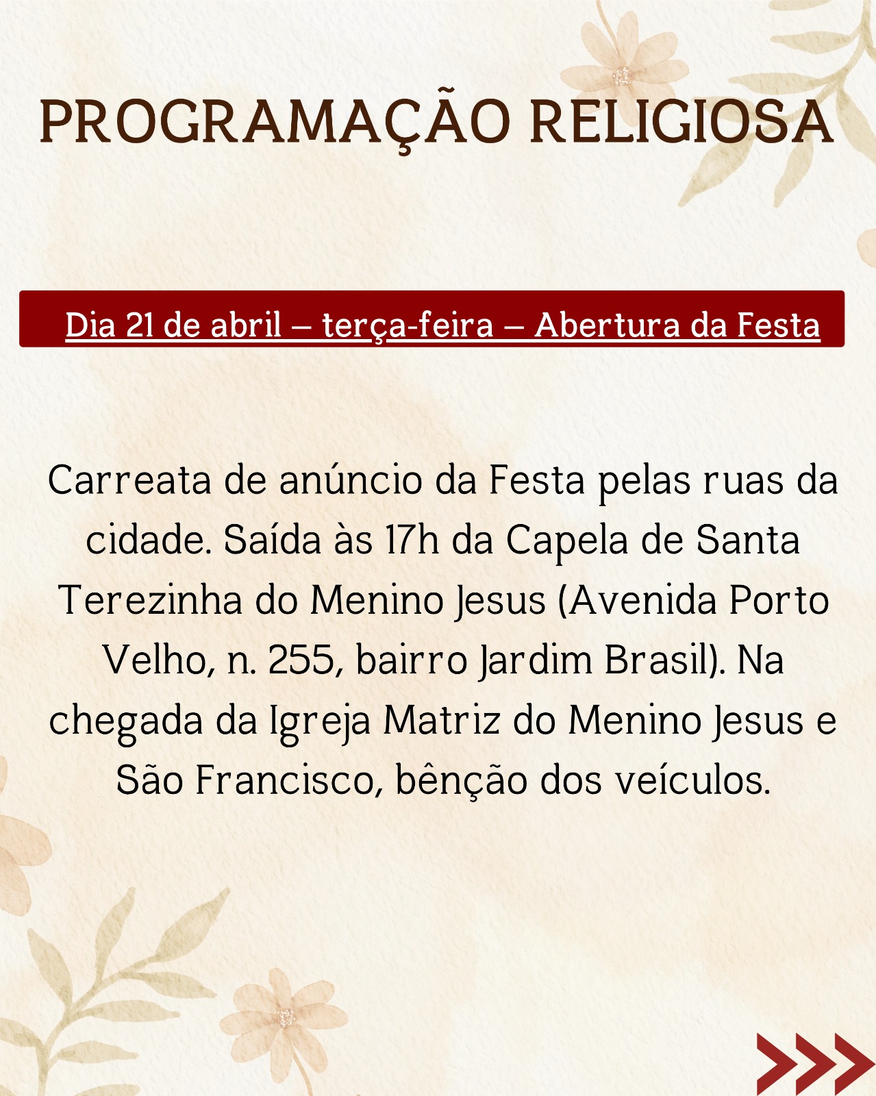 A programação terá início no dia 21 de abril, com a tradicional carreata de anúncio da festa, levando a imagem do Menino Jesus pelas ruas da cidade e convidando todos os fiéis a viverem este tempo de graça.