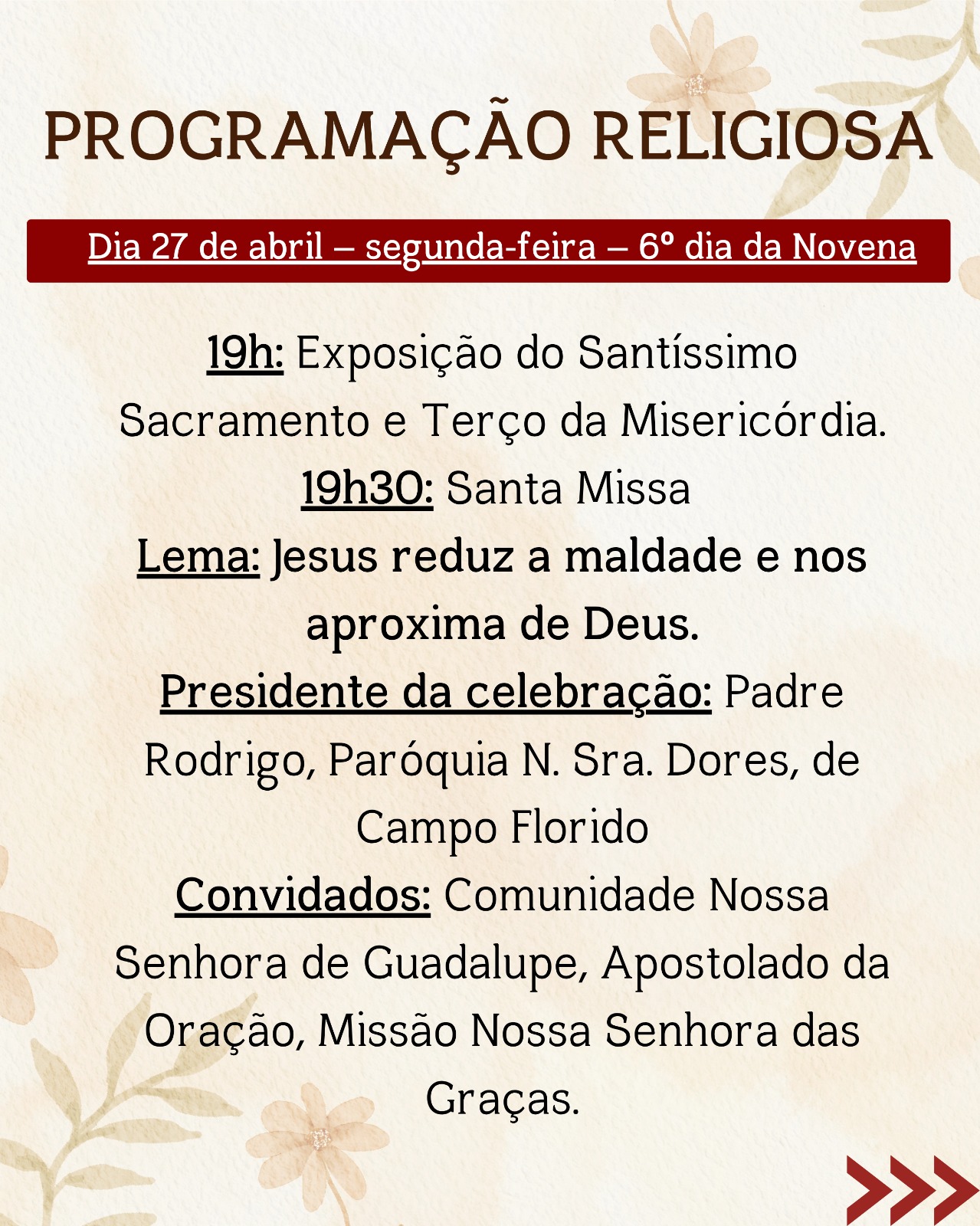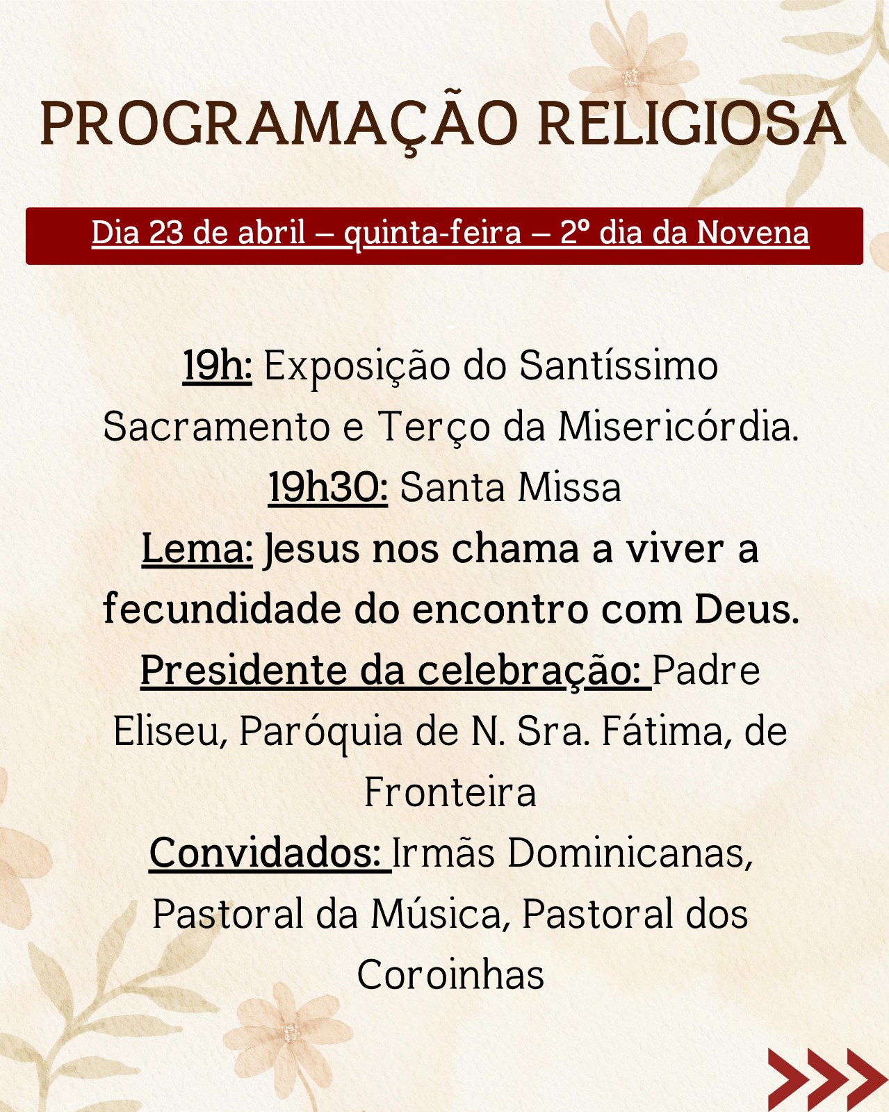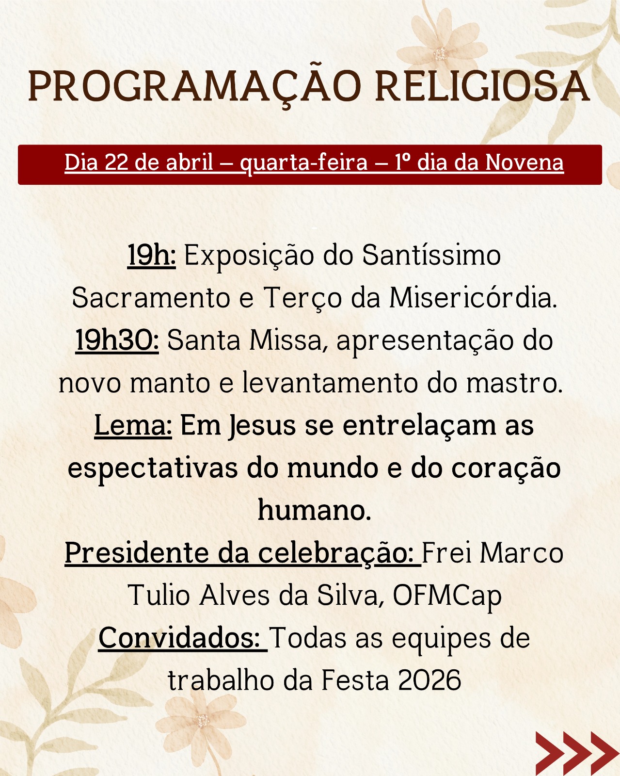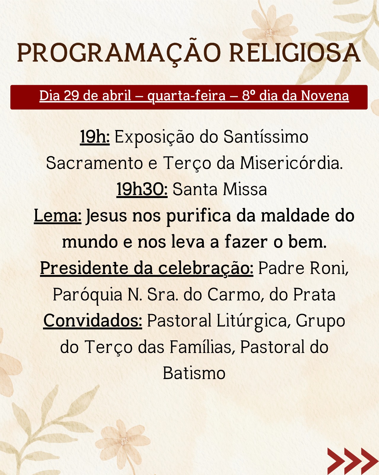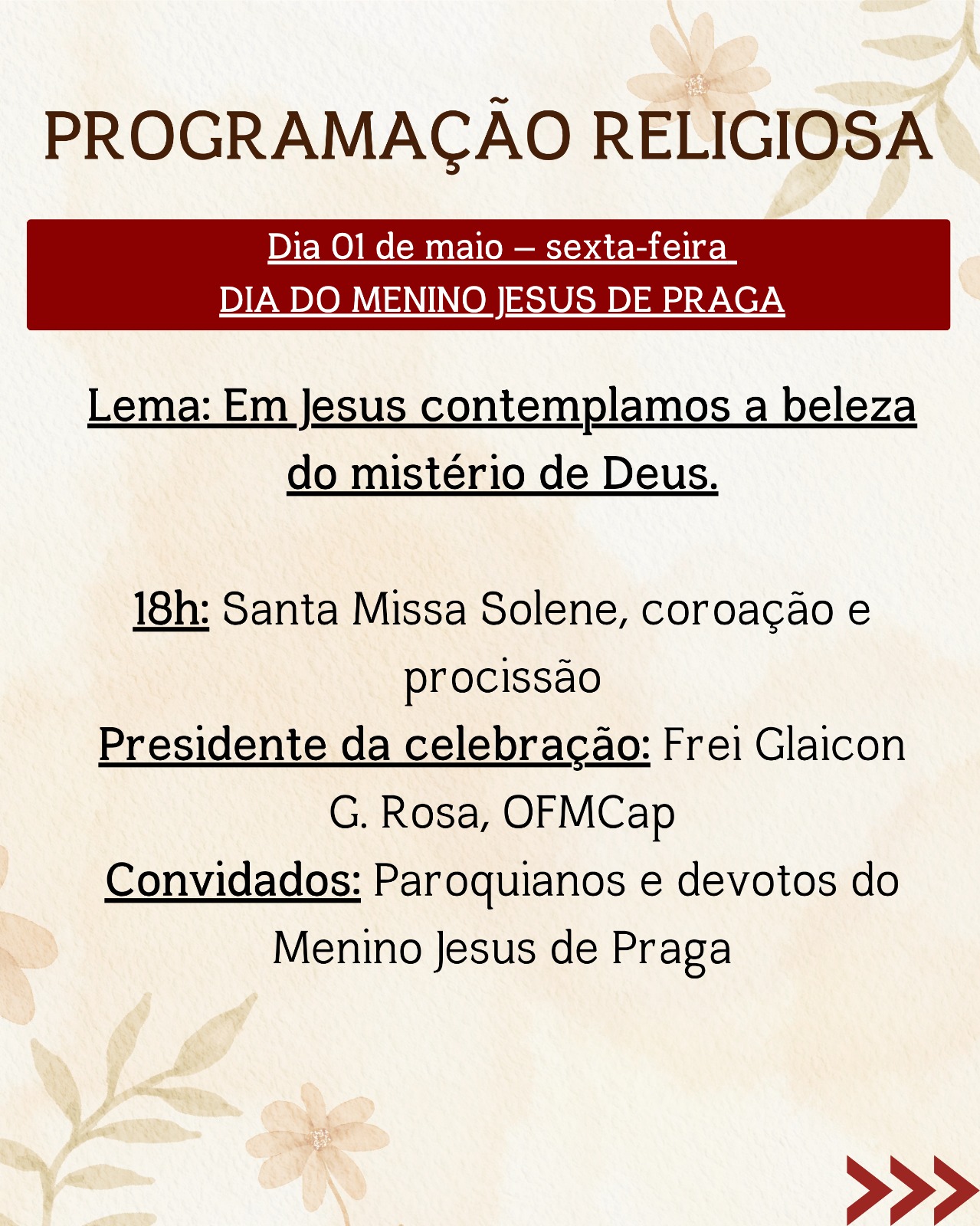 De 22 a 30 de abril, acontecerá a Novena em honra ao Menino Jesus de Praga, com celebrações diárias que proporcionarão momentos intensos de oração, reflexão e fortalecimento da fé, reunindo a comunidade em preparação para o dia festivo.