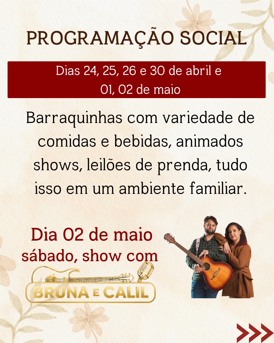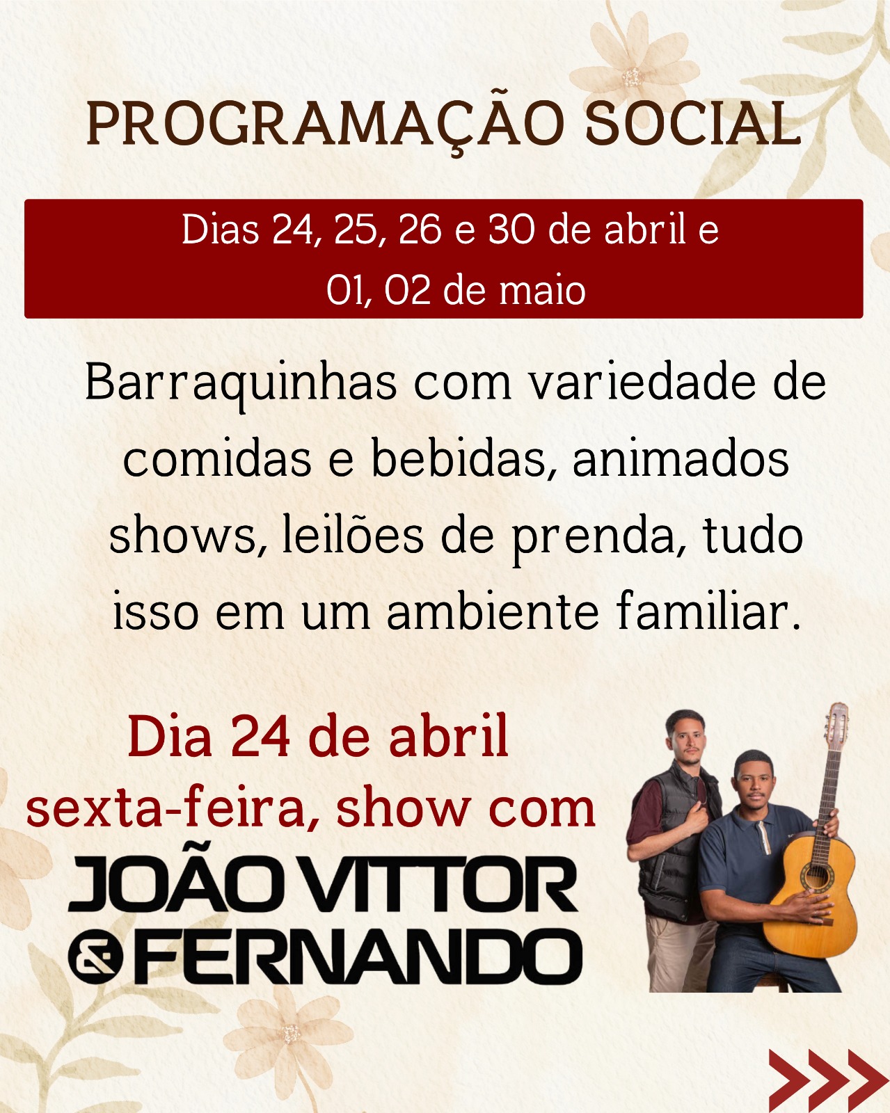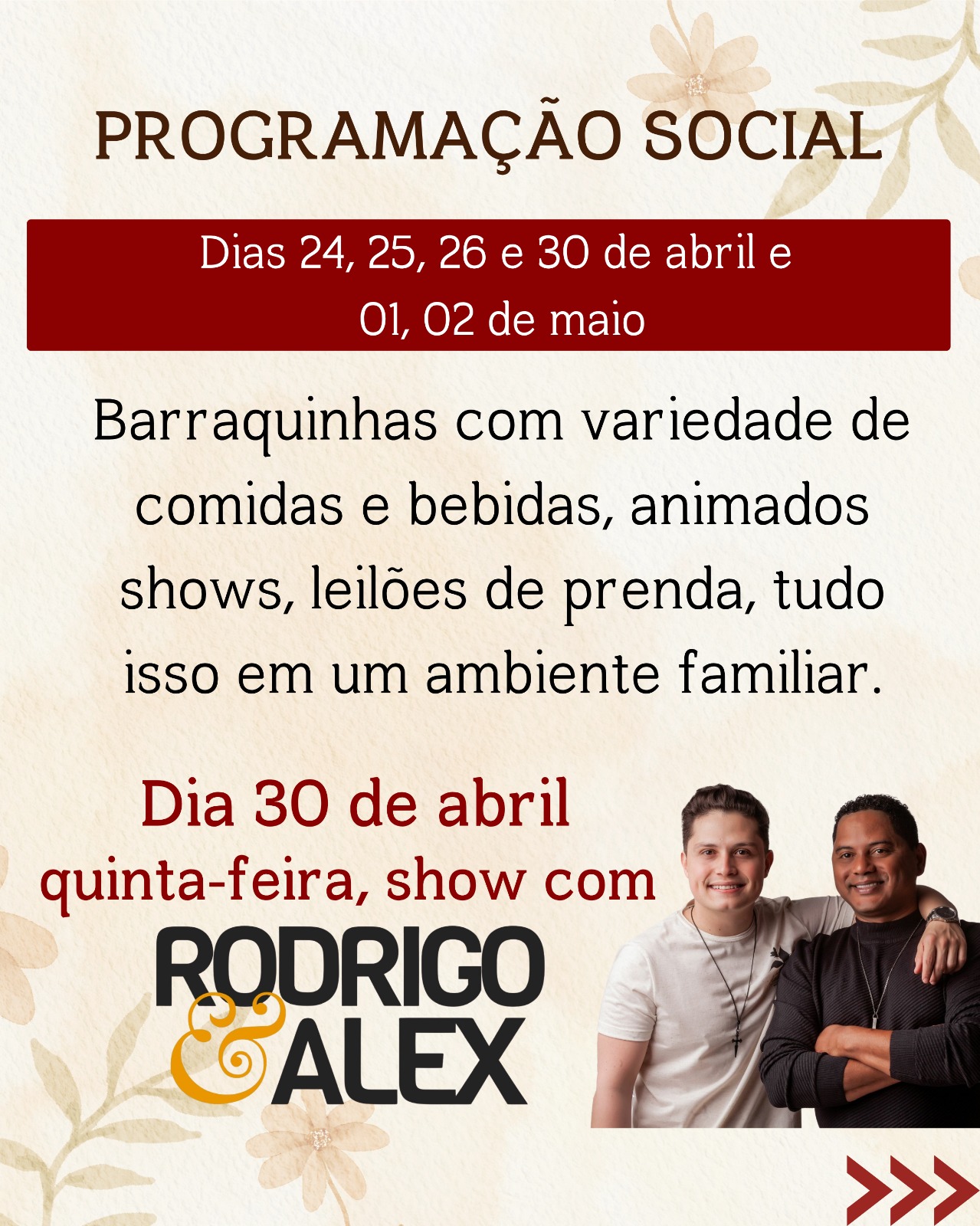 Paralelamente à programação religiosa, a festa contará com uma programação social animada e familiar. Nos dias 24, 25, 26 e 30 de abril, e 01 e 02 de maio, haverá barracas com grande variedade de comidas e bebidas, além de shows e leilões de prendas, promovendo a convivência fraterna e a alegria entre os participantes.