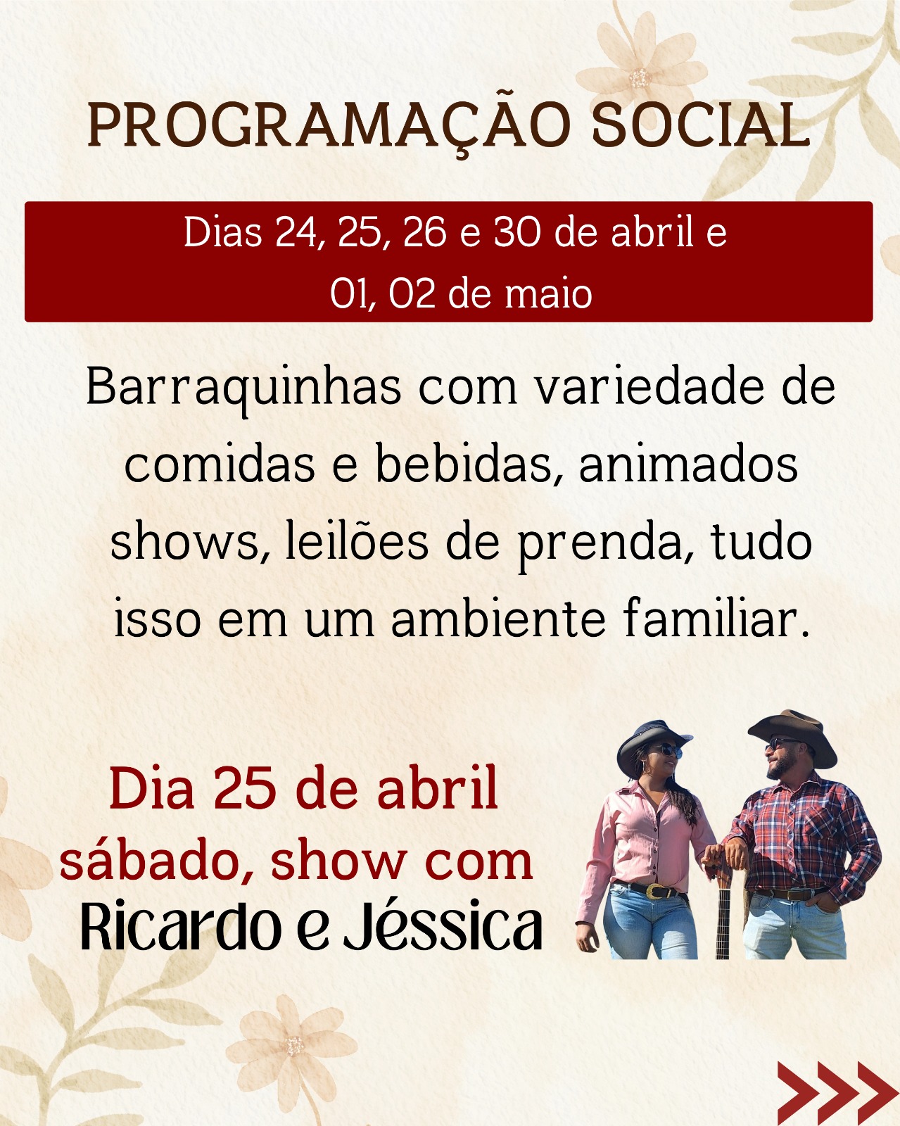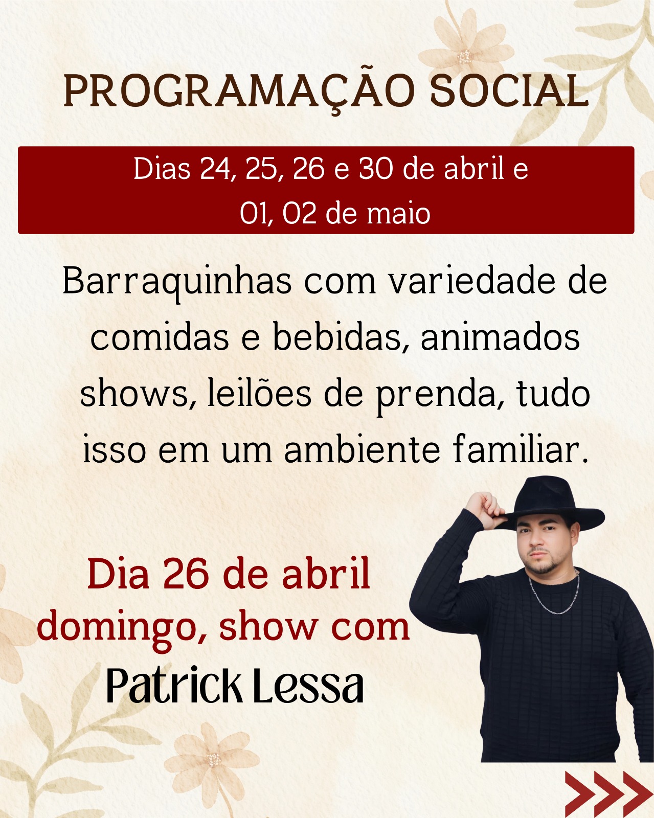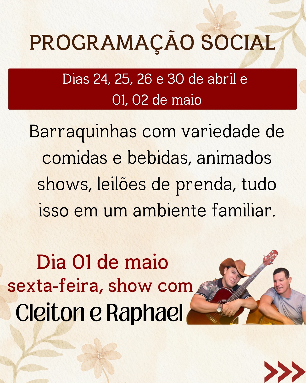 Paralelamente à programação religiosa, a festa contará com uma programação social animada e familiar. Nos dias 24, 25, 26 e 30 de abril, e 01 e 02 de maio, haverá barracas com grande variedade de comidas e bebidas, além de shows e leilões de prendas, promovendo a convivência fraterna e a alegria entre os participantes.