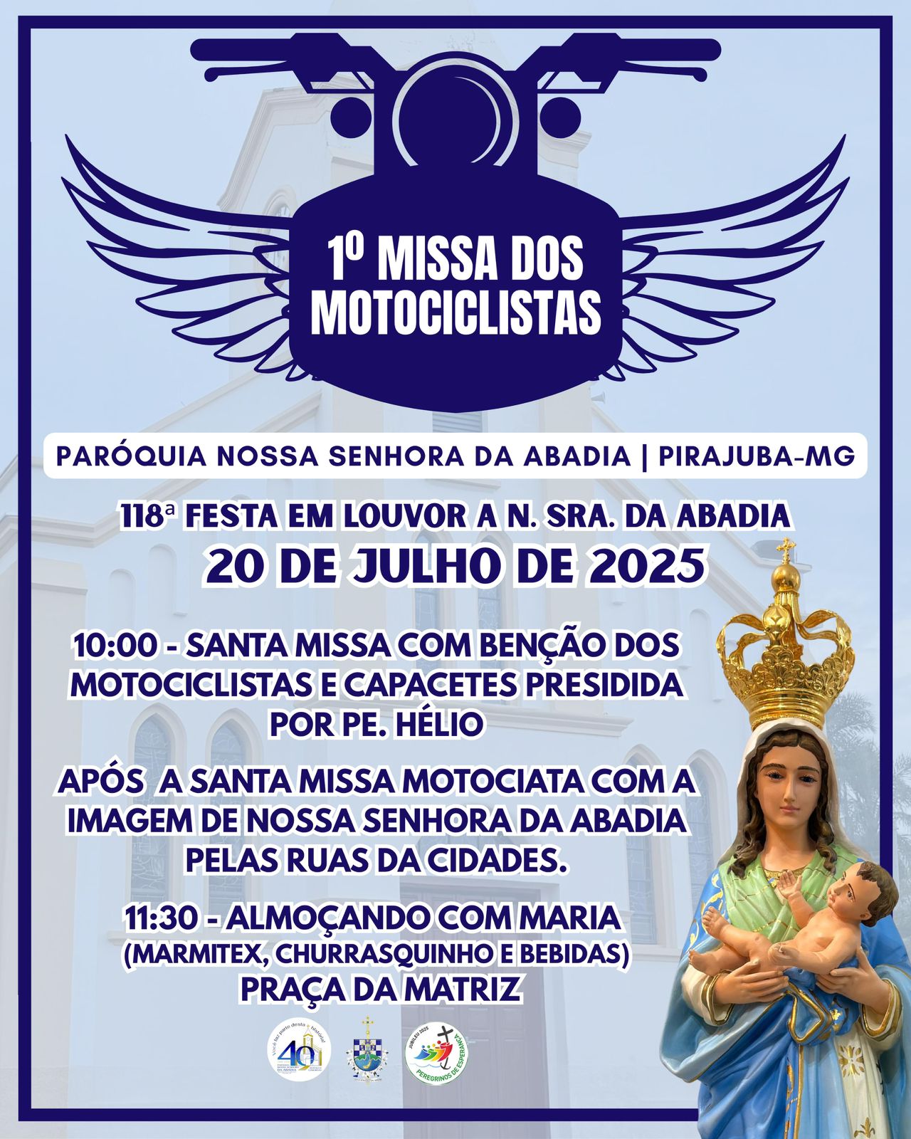 Destaque para a 10ª Missa dos Motociclistas, no dia 20/07, às 10h, presidida por Pe. Hélio. A celebração incluirá a bênção dos motociclistas e capacetes, seguida por uma motociata com a imagem da padroeira pelas ruas da cidade. Após a missa, os participantes poderão desfrutar do "Almoçando com Maria" com a possibilidade de retirar o marmitex. Aquele delicioso churrasquinho, também já está confirmado, na Praça da Matriz.