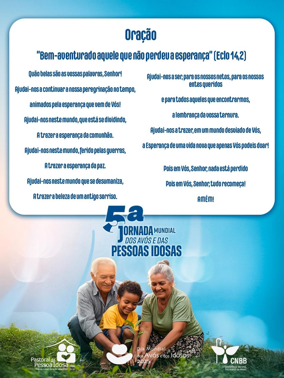 Em sua mensagem para o evento, que foi instituído pelo saudoso Papa Francisco em 2021, seu sucessor, o Papa Leão XIV, reforçou o chamado à esperança: “Na velhice, a fé e o amor não se esvaem; tornam-se sinais luminosos para o mundo. Visitar um idoso é encontrar Cristo, que nos liberta da indiferença”. O Pontífice ainda lembrou que, mesmo na fragilidade, os idosos são chamados a renovar-se diariamente na oração e no amor, sendo testemunhas vivas da promessa divina.