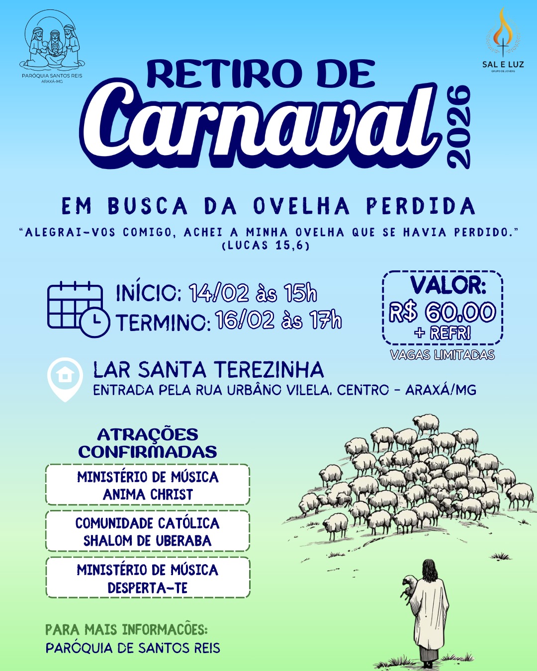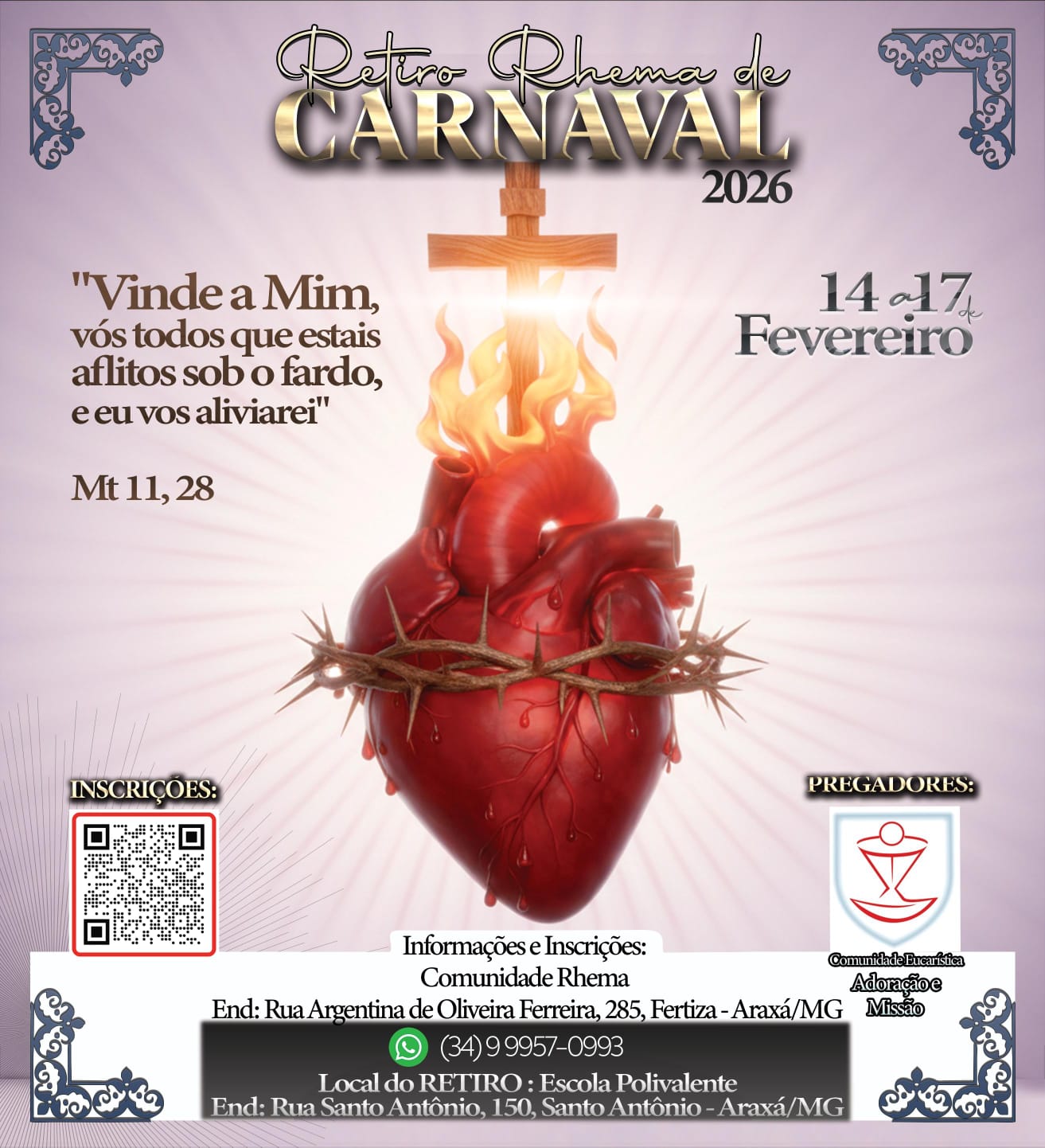 Já a Comunidade Rhema promove seu retiro de Carnaval de 2026, com o tema “Vinde a Mim, vós todos que estais aflitos sob o fardo, e eu vos aliviarei” (Mt 11,28). O retiro será na Escola Polivalente, de 14 a 17/2 e contará com a presença de Rafael, missionário da Comunidade Eucarística Ação e Missão, de São José dos Campos (SP), que virá partilhar importantes reflexões. A Comunidade Eucarística Adoração e Missão é responsável pela equipe de pregação do evento.