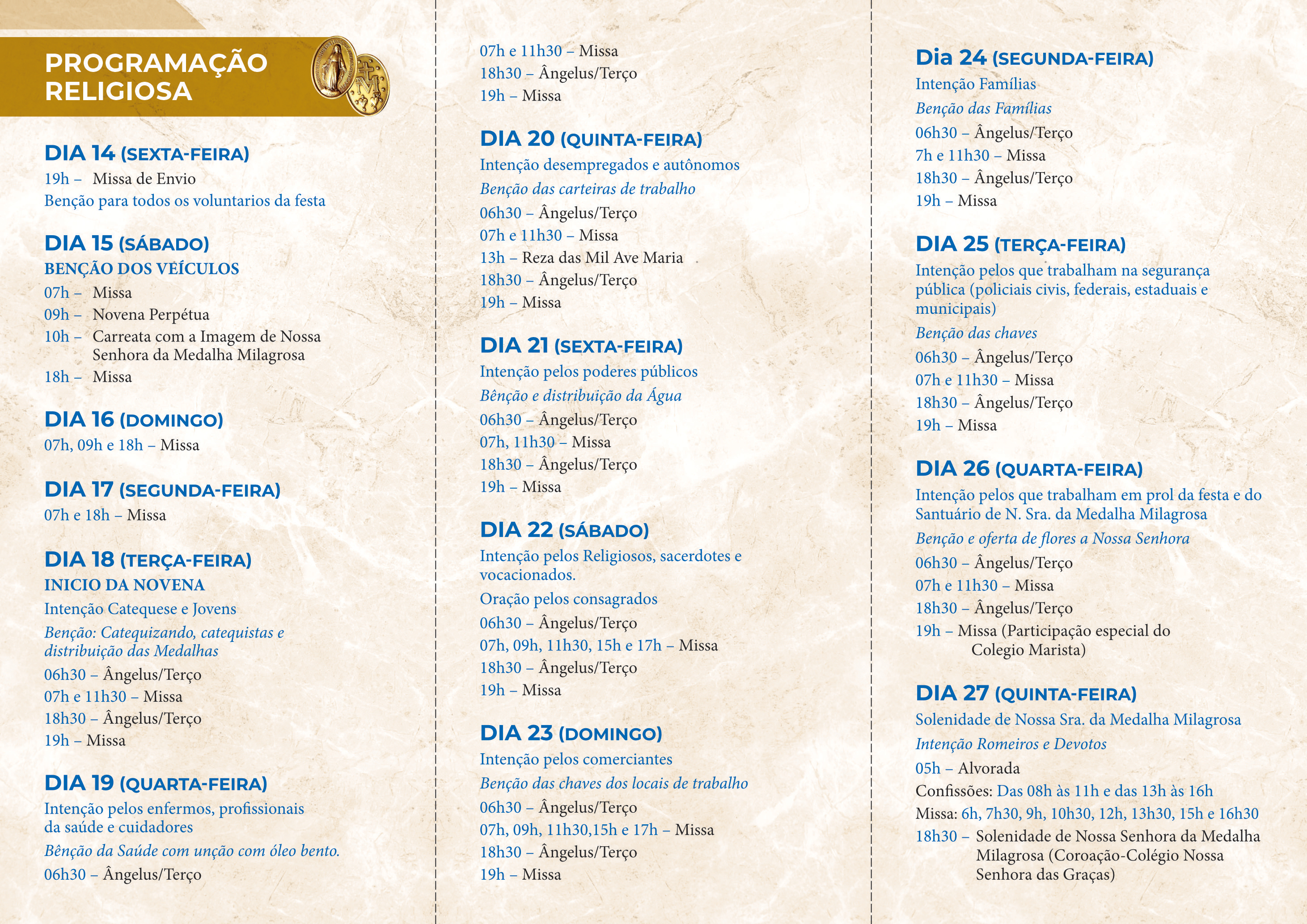 Senhora da Medalha Milagrosa. Uma intensa programação marcará o dia, com