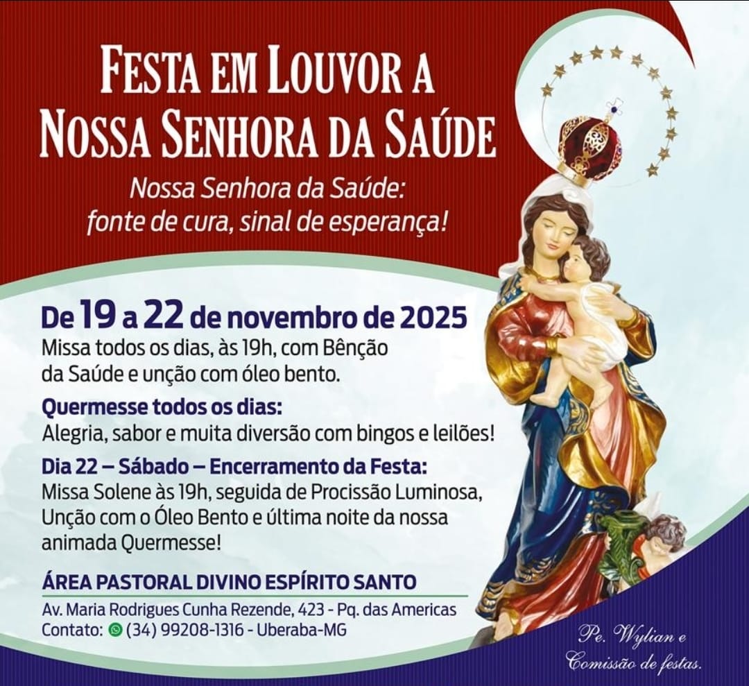 22 de novembro de 2025, acontece a festa em honra a Nossa Senhora da Saúde,