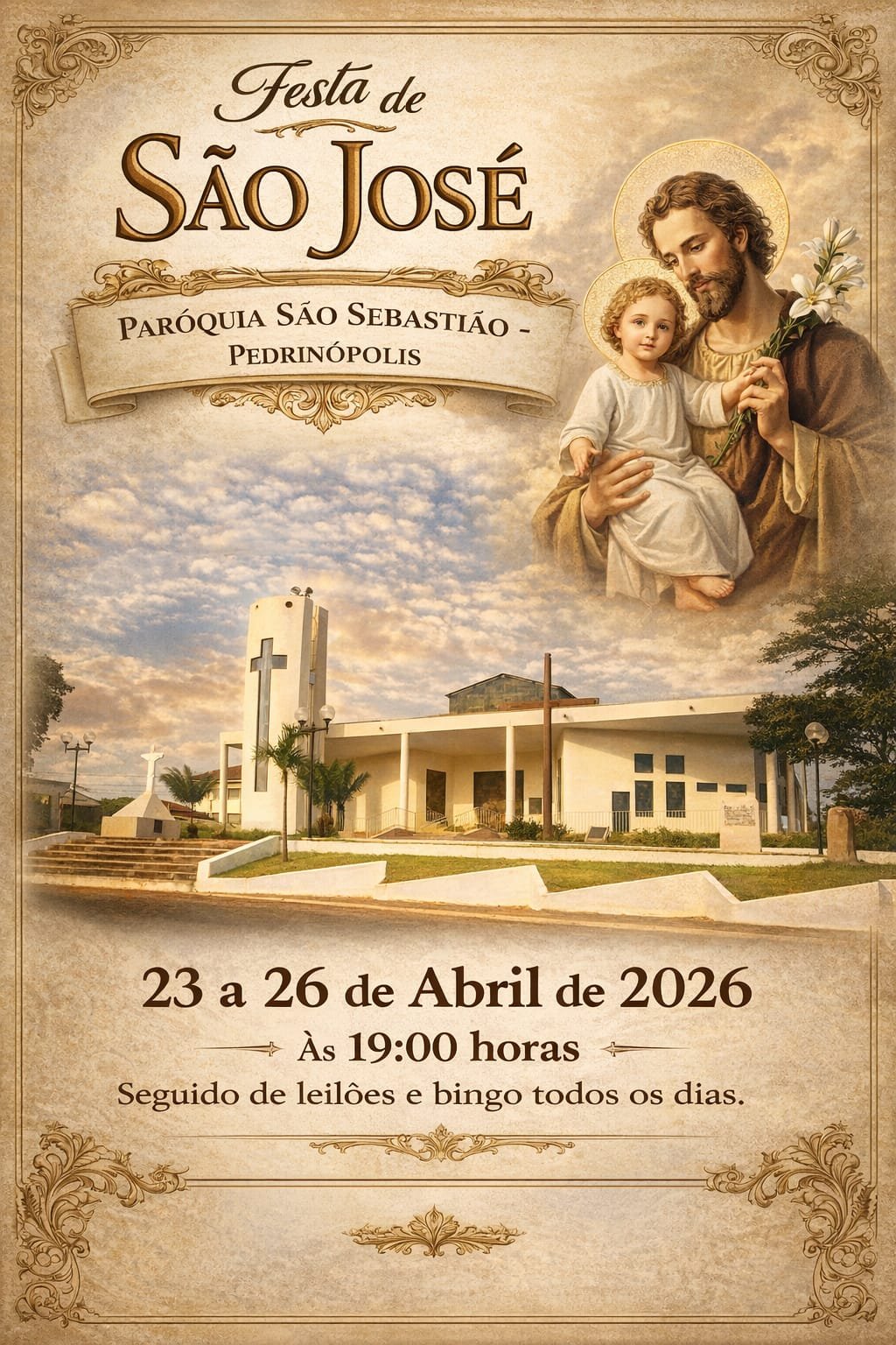 A Paróquia São Sebastião, em Pedrinópolis, convida toda a comunidade para a tradicional Festa de São José, que será realizada de 23 a 26 de abril de 2026.