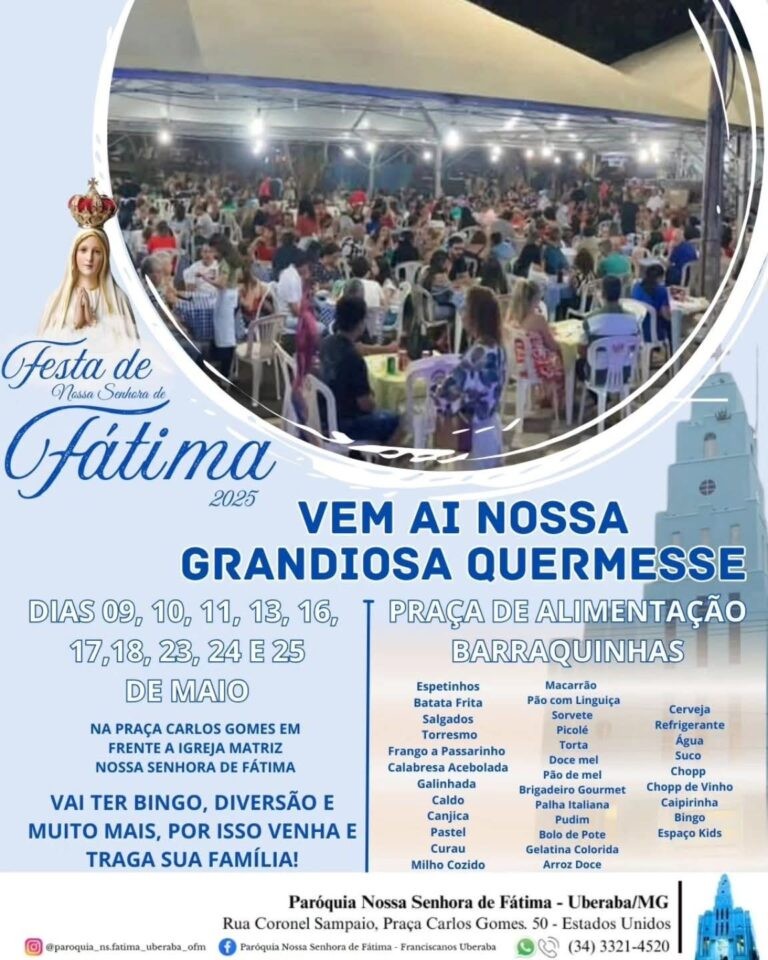 Sob o tema “Com Nossa Senhora de Fátima, somos peregrinos de esperança!” e o lema “Senhora de Fátima: esperança nossa, salve!”, a Paróquia Nossa Senhora de Fátima realiza sua tradicional Festa em honra da Virgem entre os dias 09 e 25 de maio, na Praça Carlos Gomes, em Uberaba/MG. O evento integra momentos de devoção e celebração comunitária, destacando-se a “Trezena da Padroeira”, que teve início no dia 30 de abril e irá até 12 de maio, preparando os fiéis para a “Solenidade de 13 de maio”, data marcada por missas às 6h, 12h, 15h e 19h30, esta última seguida da emocionante “Procissão das Luzes”.