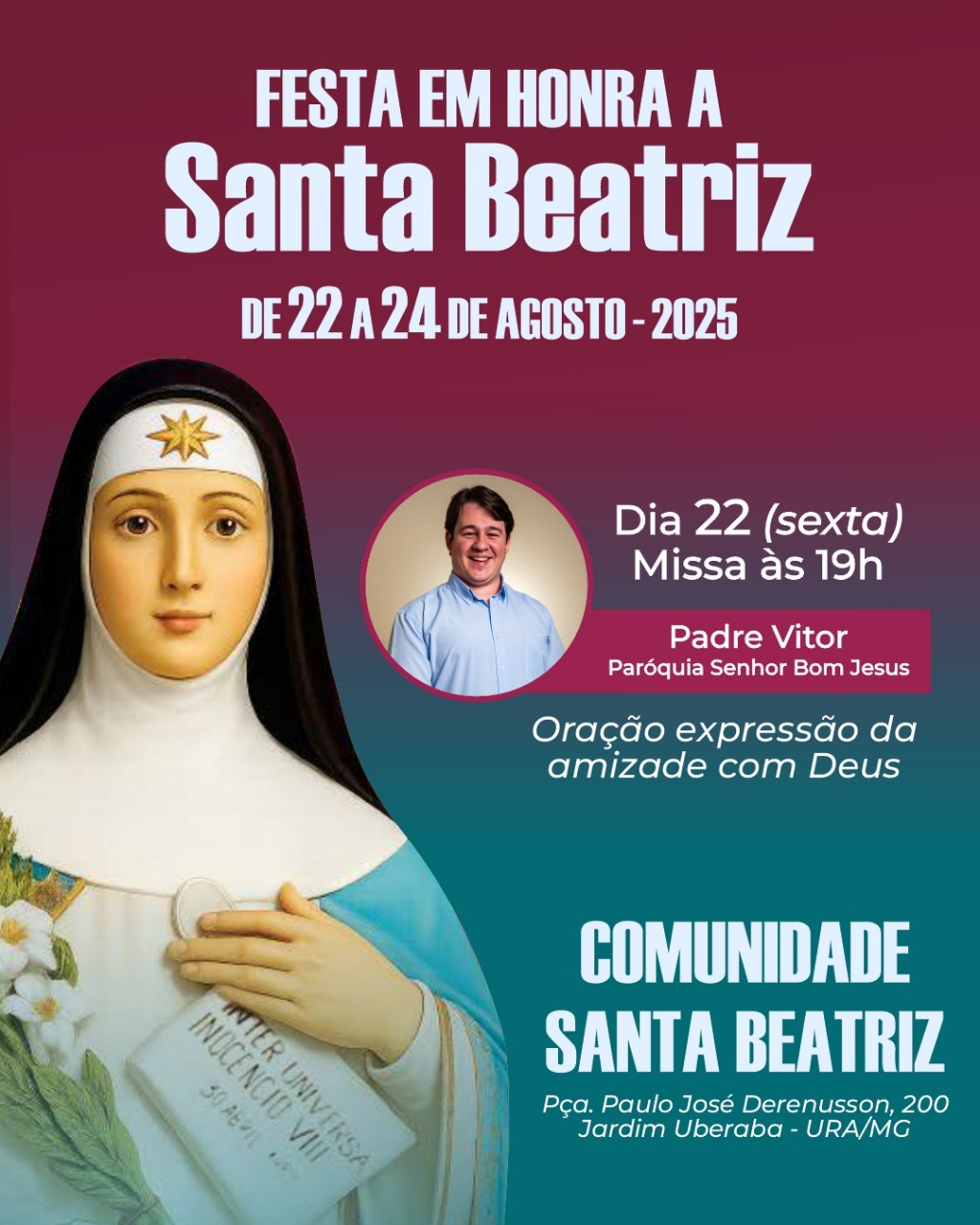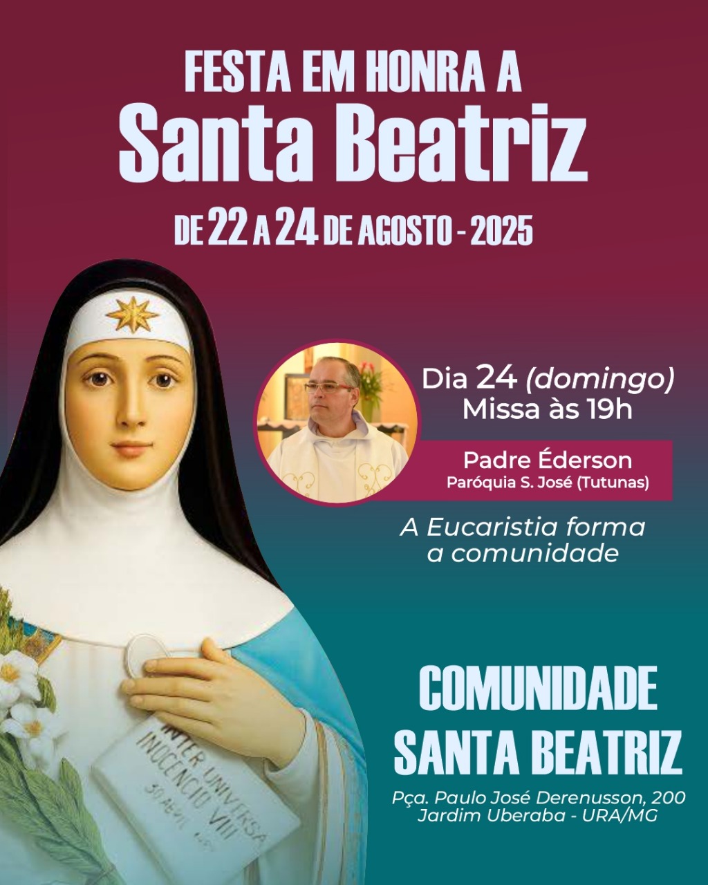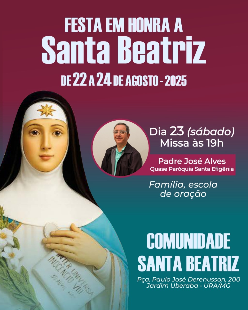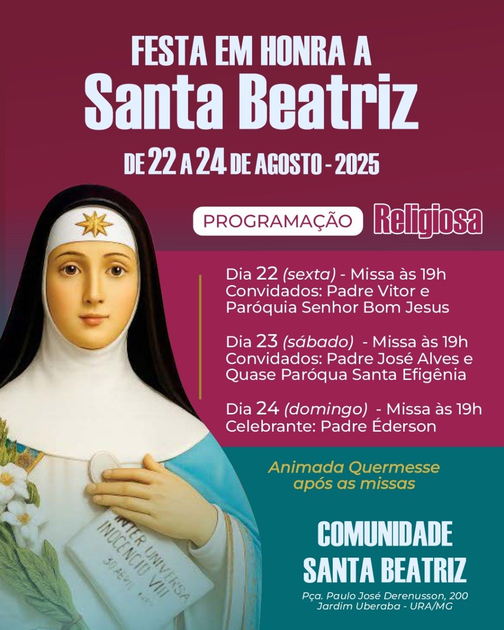 A festa é uma oportunidade para vivenciar a fé em comunidade, fortalecer laços e celebrar a vida de Santa Beatriz. Todos estão convidados a participar deste momento de graça e alegria, na Praça Paulo José Derenusson, 200, Jardim Uberaba - URA/MG.