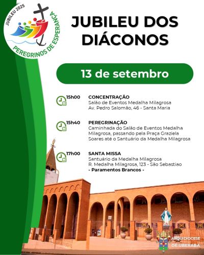 A programação do Jubileu, um verdadeiro itinerário de fé, terá início às 15h, com uma concentração no Salão de Eventos Medalha Milagrosa. De lá os fiéis, clero, religiosos e, de modo especial, os diáconos com suas famílias, iniciarão uma peregrinação simbólica às 15h40. Esta caminhada, passando pela Praça Graziela Soares, representa a própria jornada de serviço e anúncio da esperança que define seu ministério. O ponto culminante será a Santa Missa das 17h, no Santuário da Medalha Milagrosa, onde se unirão em ação de graças, vestindo paramentos brancos em sinal de alegria e santidade.