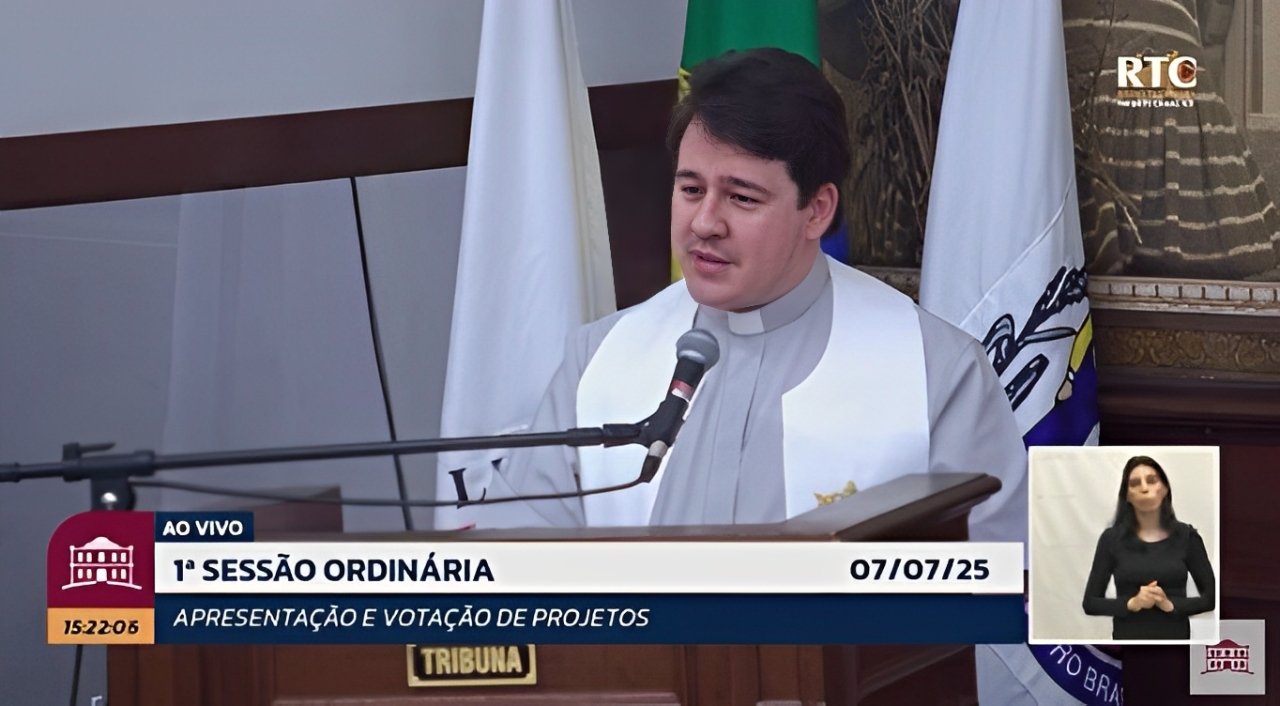 A primeira sessão ordinária de julho da Câmara Municipal de Uberaba, realizada nesta segunda-feira (7), foi aberta com uma mensagem ecumênica proferida pelo Padre Vitor Lacerda, Coordenador de Pastoral Adjunto da Arquidiocese de Uberaba e pároco da Paróquia Senhor Bom Jesus. Recepcionado pela vereadora Rochelle Gutierrez (PDT), o sacerdote destacou o papel sagrado da Casa Legislativa como espaço do povo e, portanto, "casa de Deus".