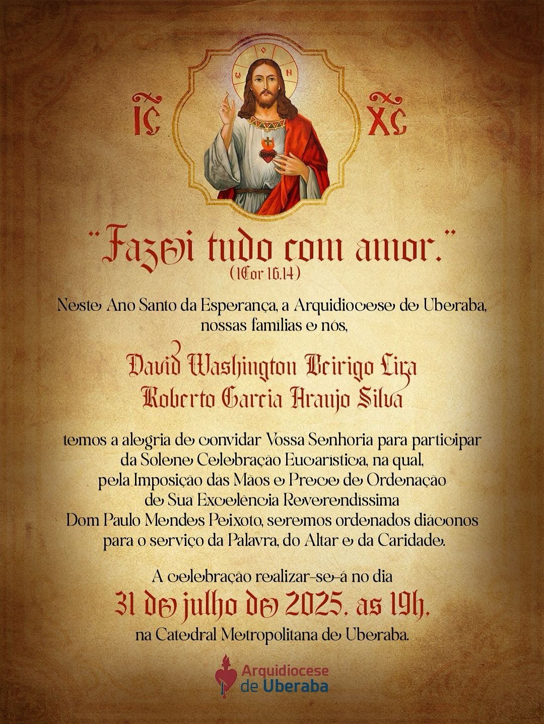 Sob o lema inspirador "Fiz tudo com amor" (1 Cor 16:14), a Arquidiocese de Uberaba vive um momento ímpar de fé e esperança. No próximo dia 31 de julho, às 19h, a Catedral Metropolitana será palco da solene Ordenação Diaconal de David Washington Beirigo Lira e Roberto Garcia Araujo Silva.