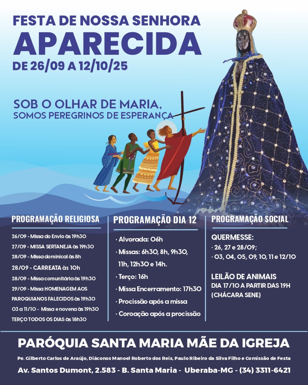 A Paróquia Santa Maria Mãe da Igreja convida toda a comunidade de Uberaba e região para a grandiosa Festa de Nossa Senhora Aparecida, que será realizada de 26 de setembro a 12 de outubro de 2025. Com o tema “Sob o olhar de Maria, somos peregrinos de esperança”, o evento promove um profundo mergulho espiritual aliado a uma vibrante programação social, reforçando os laços de fé e comunhão.