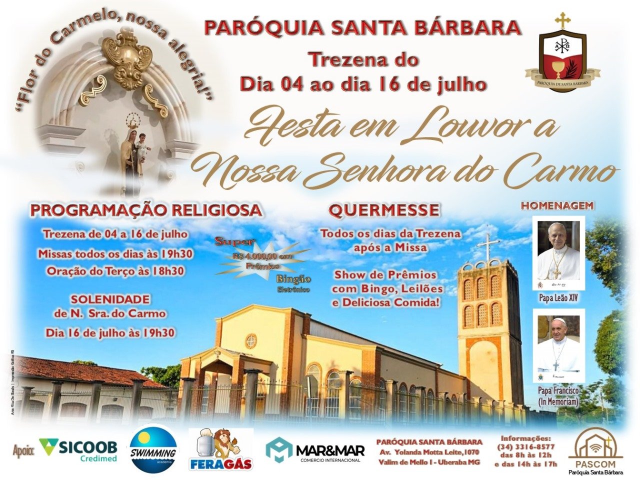 A Paróquia Santa Bárbara, em Uberaba, convida toda a comunidade para participar da Festa em Louvor a Nossa Senhora do Carmo 2025, um dos eventos mais tradicionais da cidade, que acontecerá de 04 a 16 de julho. A festividade contará com a presença e condução do novo pároco, Frei Anizio Rodrigues de Oliveira Filho, OFM, e promete ser um momento marcante de fé, devoção e comunhão.