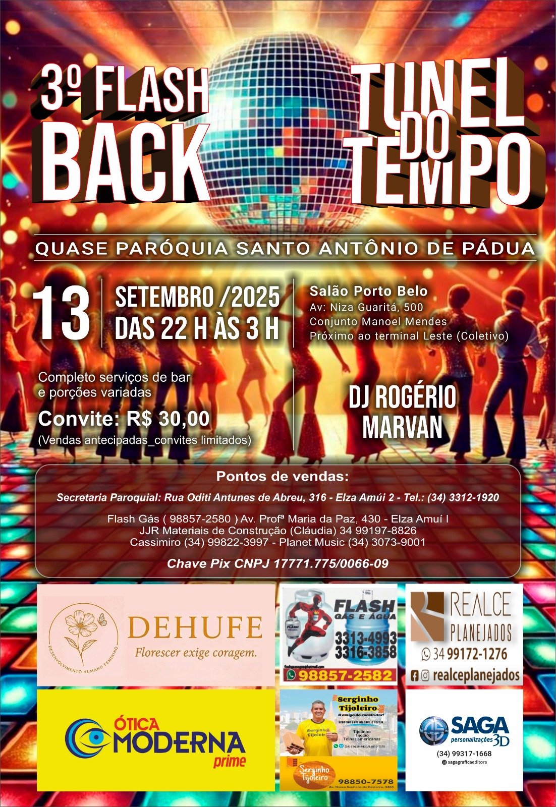 A comunidade católica de Uberaba e região se prepara para uma noite especial: a terceira edição do Flashback - Túnel do Tempo", um evento beneficente que promete reviver os sucessos das décadas passadas em clima de muita fraternidade e alegria. A festa acontece no dia 13 de setembro, das 22h às 3h, no Salão Porto Belo, localizado na Av. Niza Guaritá, 500, no Conjunto Manoel Mendes.
