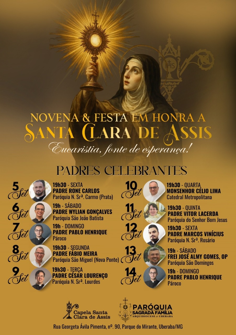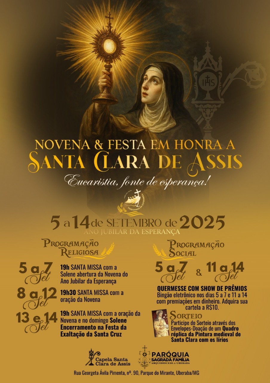 A Capela Santa Clara de Assis, pertencente à Paróquia Sagrada Família, convida os fiéis para um momento de fé, comunidade e esperança. De 5 a 14 de setembro de 2025, será realizada a tradicional Novena e Festa em honra à santa franciscana, padroeira da televisão e da visão clara, sob o tema inspirador “Eucaristia, fonte de esperança”.