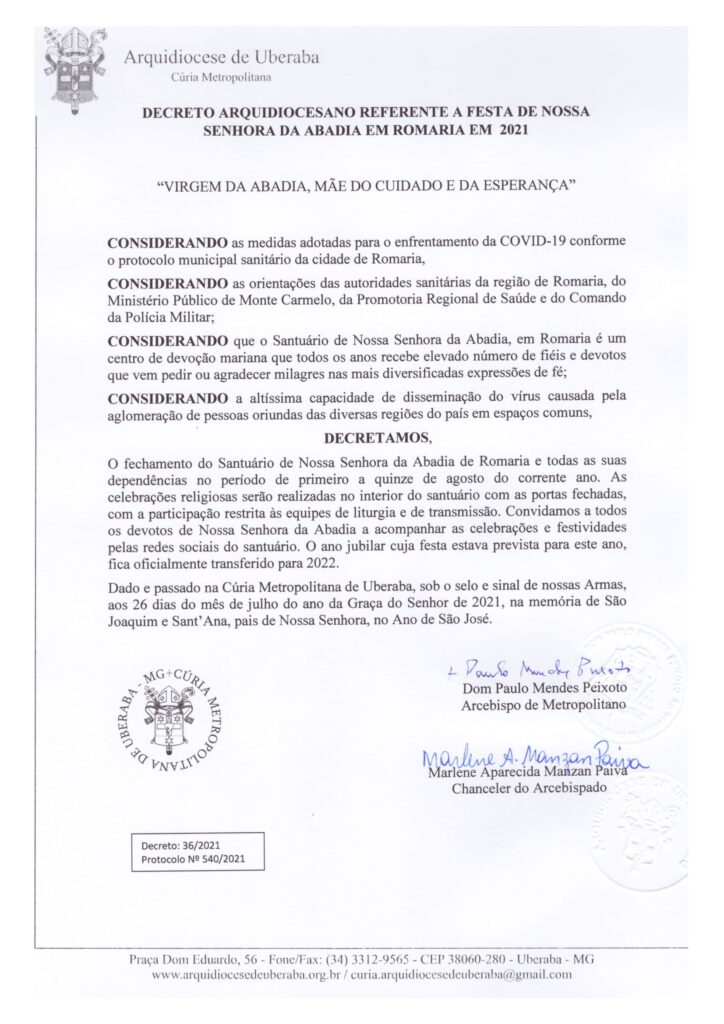Decreto Arquidiocesano sobre a Festa da Abadia, em Romaria em 2021