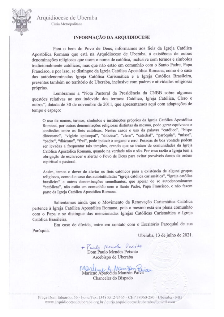 Para o bem do Povo de Deus, informamos aos fieis da Igreja Católica Apostólica Romana que está na Arquidiocese de Uberaba, a existência de outras denominações religiosas que usam o nome de católica, inclusive com termos e símbolos tradicionalmente católicos, mas que não estão em comunhão com o Santo Padre, Papa Francisco, e por isso, se distingue da Igreja Católica Apostólica Romana, como é o caso das autodenominadas Igreja Católica Carismática e a Igreja Católica Brasileira, presentes também no território de Uberaba, inclusive com padres e atividades religiosas próprias.