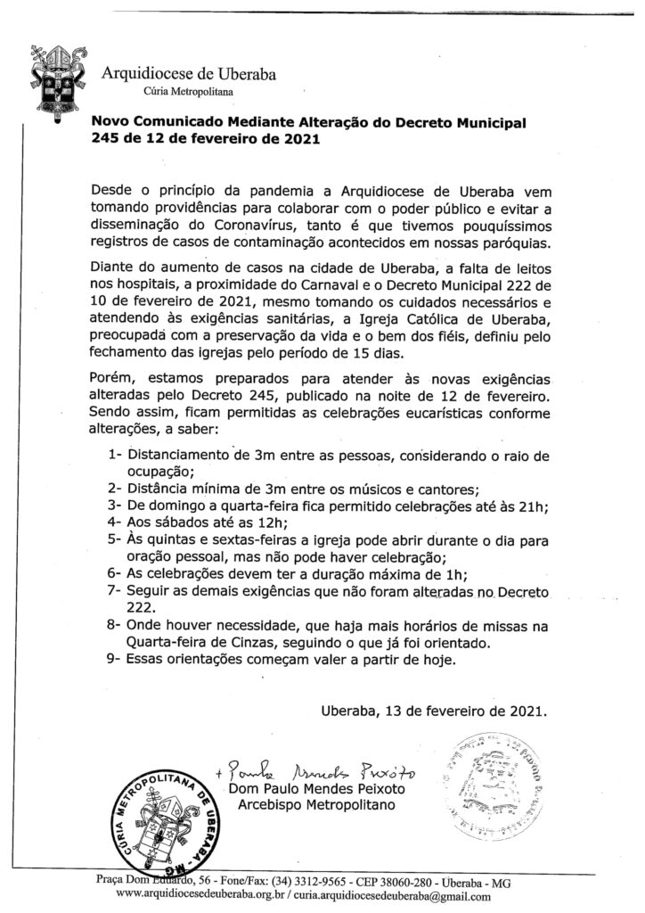 Diante do aumento de casos na cidade de Uberaba, a falta de leitos nos hospitais, a proximidade do Carnaval e o Decreto Municipal 222 de 10 de fevereiro de 2021, mesmo tomando os cuidados necessários e atendendo às exigências sanitárias, a Igreja Católica de Uberaba, preocupada com a preservação da vida e o bem dos fiéis, definiu pelo fechamento das igrejas pelo período de 15 dias.